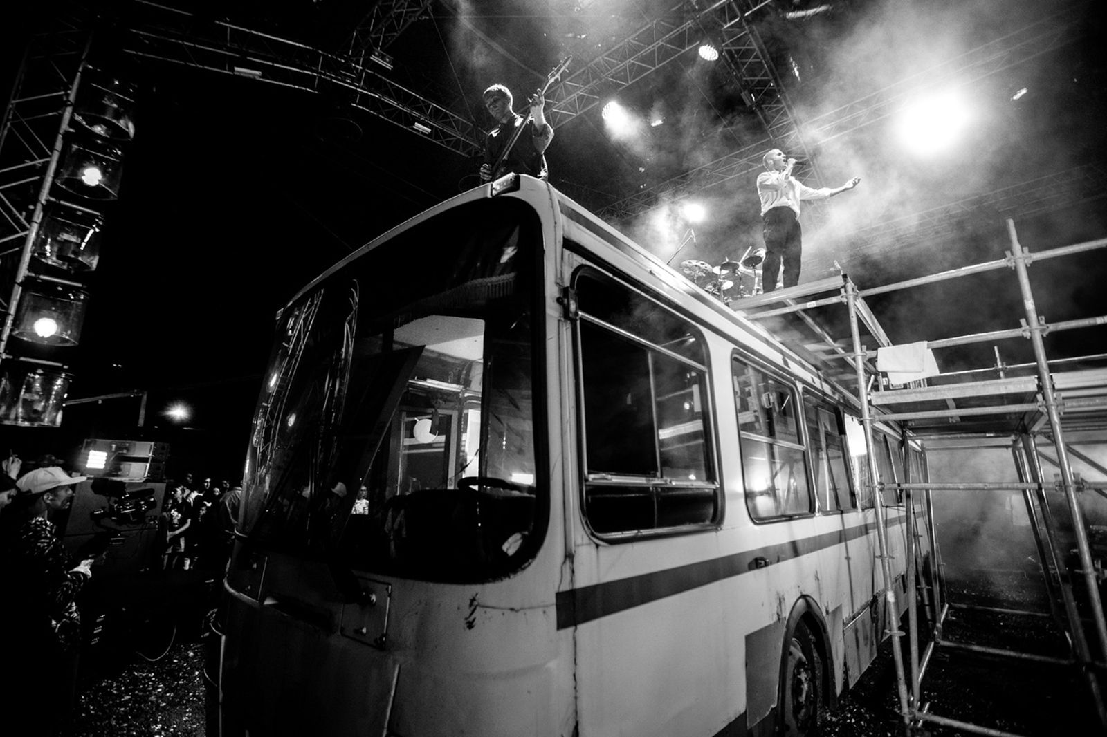 Этот довольно прямолинейный смысловой жест легко считывался зрителями, которые, возможно, испытывали гордость за земляка вперемешку с гнетущим напряжением. Подобная эмоциональная антитеза проявилась уже в самом начале концерта, когда под гимн Нижегородской области вокруг зрителей колесили пять местных автобусов, то ли окружая публику, то ли “гарцуя”, словно на параде.